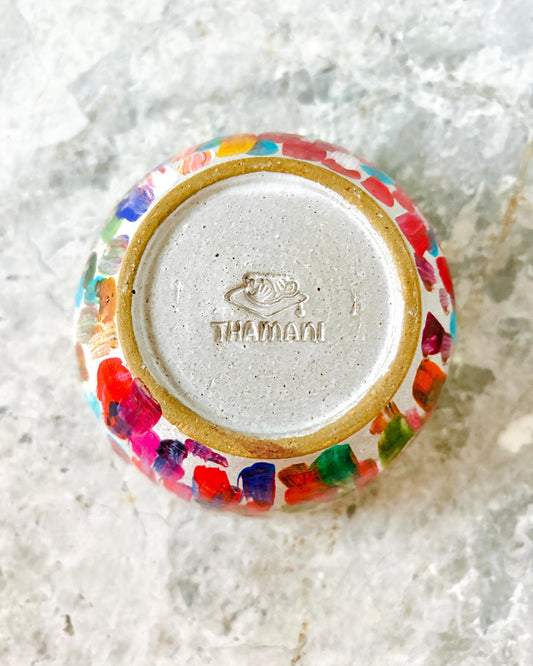 Die Thamani Bowl und die Tasse sind wahre Schätze. Ihre eckige Form macht sie zu einem besonderen Blickfang, und doch ist es die Handarbeit, die sie so einzigartig macht. Jede Linie, jeder Pinselstrich trägt eine Geschichte in sich – durch die kleinen Hände eines Kindes liebevoll bemalt, wird jedes Stück zu einem Unikat voller Seele und Wärme.