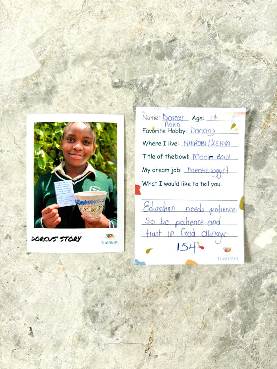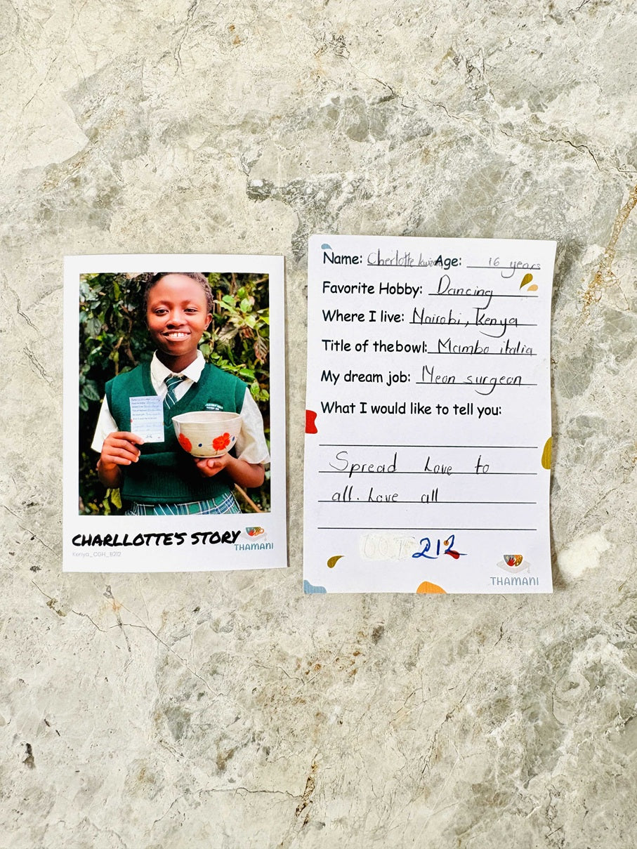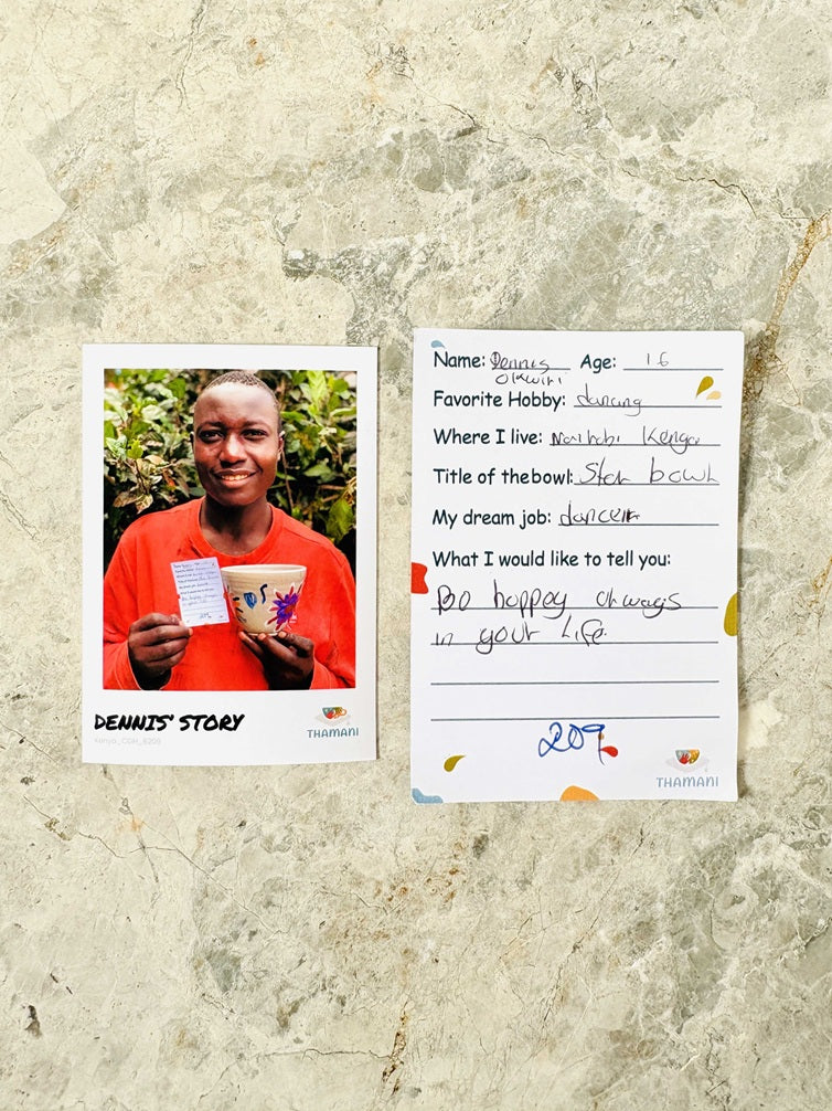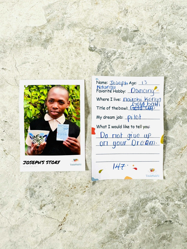 The way each child has painted the bowl is as individual as the child itself. The bowl will reach you in an attractive surprise box and contains a photo and a handwritten letter from the child.