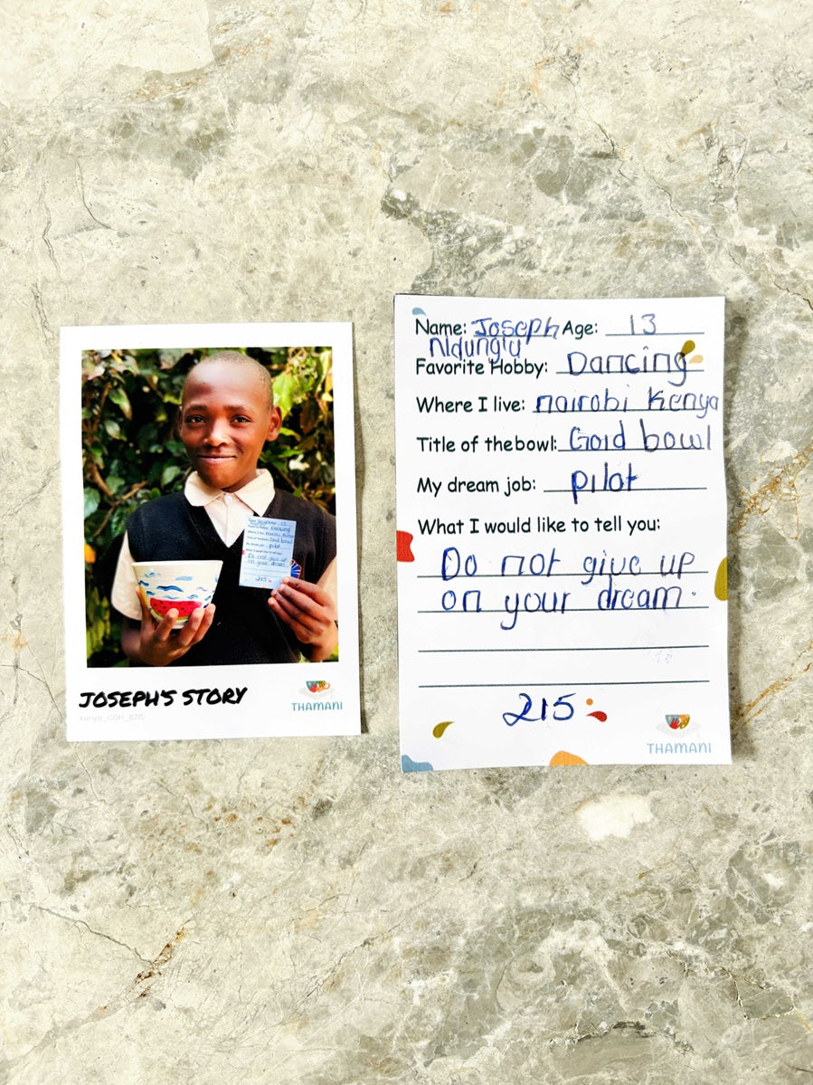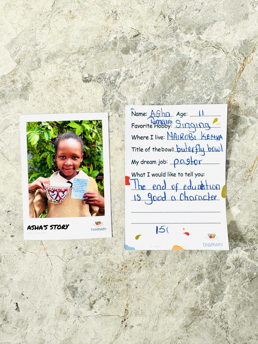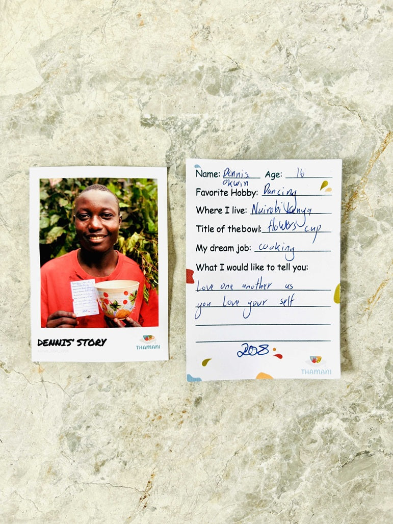 The way each child has painted the bowl is as individual as the child itself. The bowl will reach you in an attractive surprise box and contains a photo and a handwritten letter from the child.