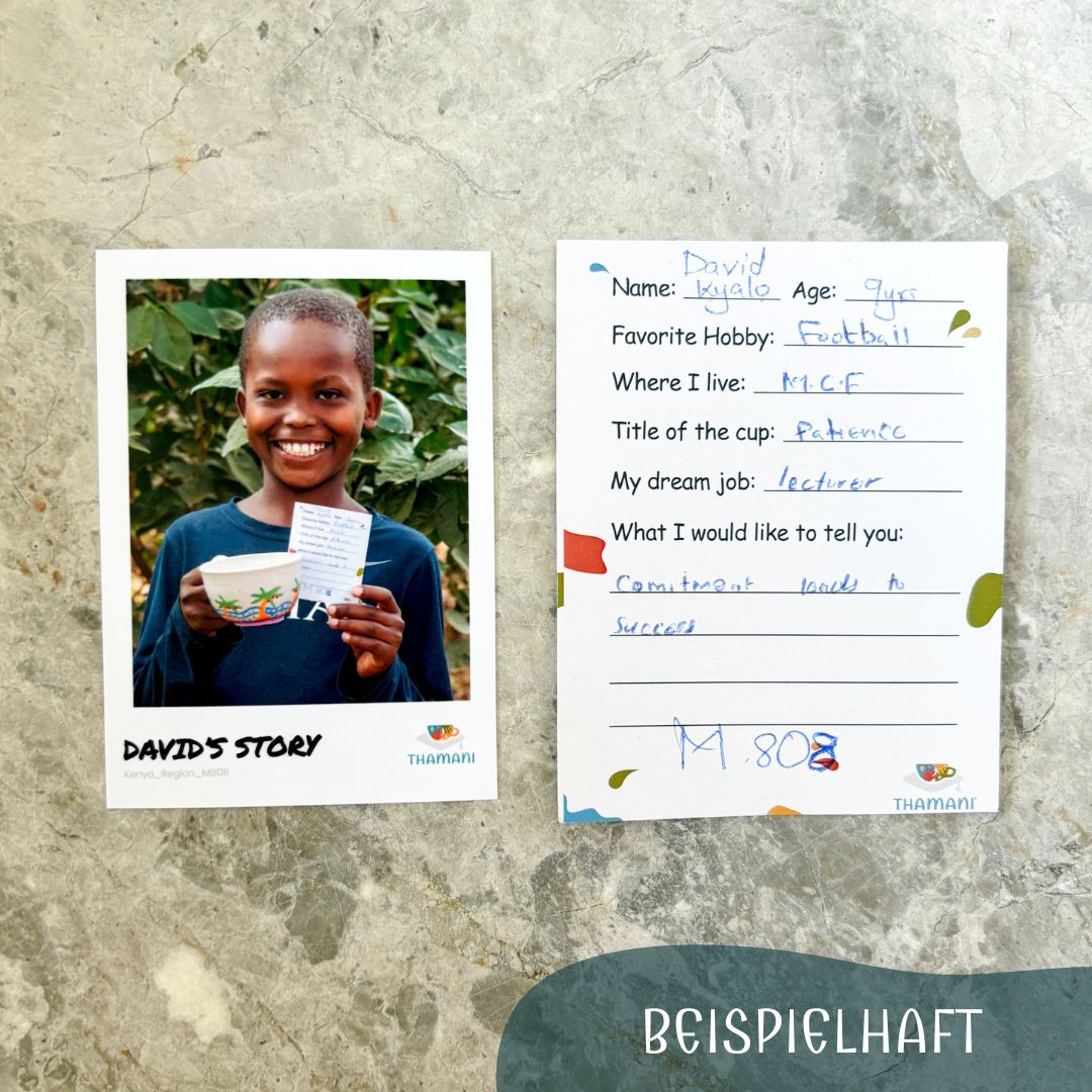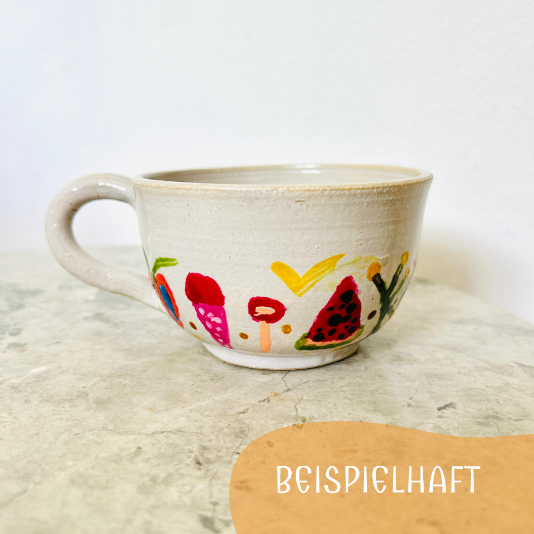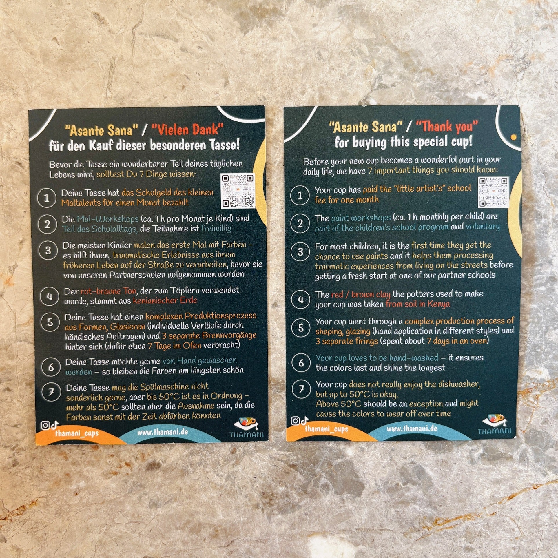 Jede Keramiktasse ist ein handgefertigtes Unikat aus Kenia! Die auf der Abbildung sichtbare Tassen ist eine beispielhafte Orientierung für die Form und Größe. Die Malerei des Kindes ist zudem so individuell wie das Kind selbst. Die Tasse wird dich in einer ansprechenden Überraschungsbox erreichen und enthält ein Foto sowie einen handgeschriebenen Brief des Kindes.