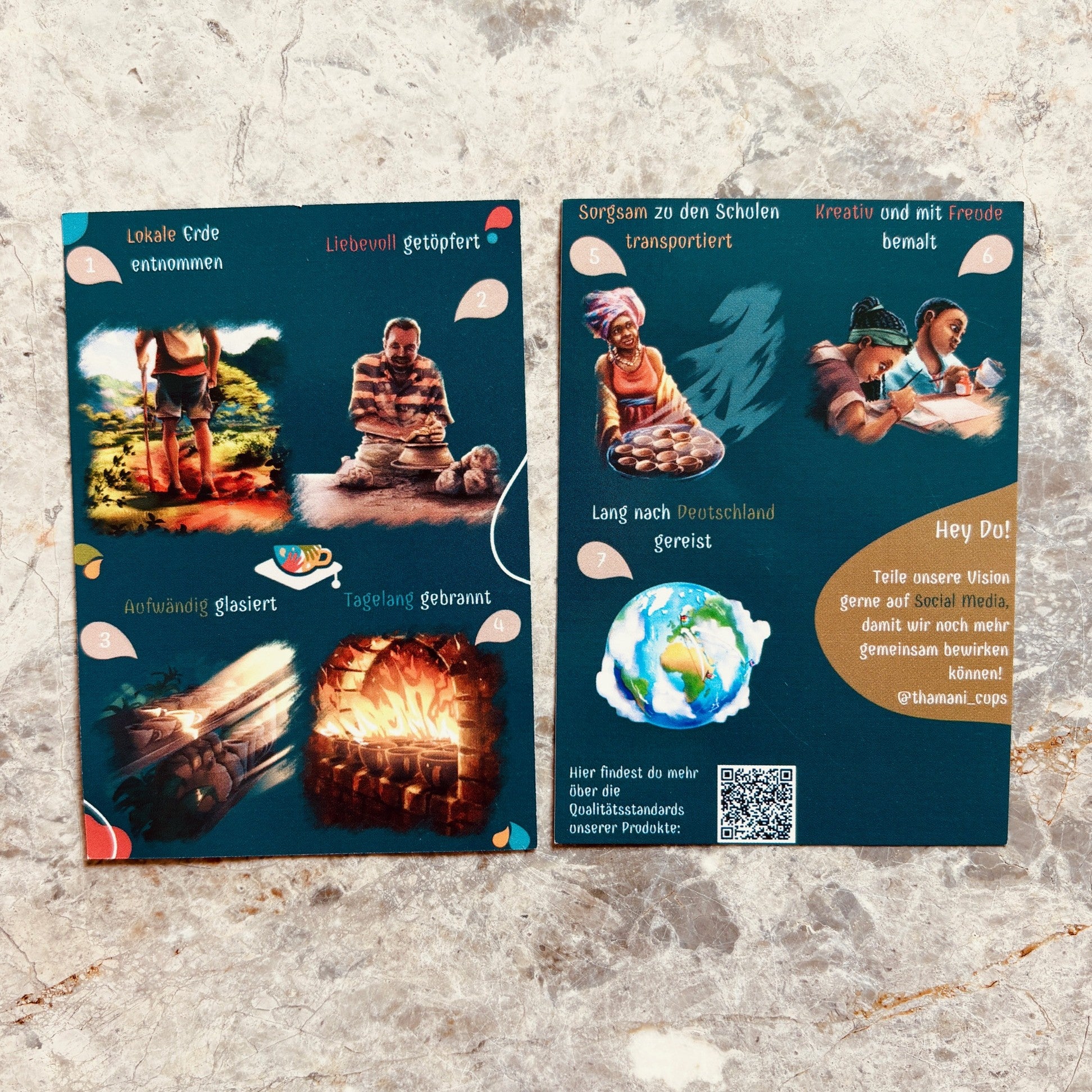 Konformitätserklärung: Die THAMANI Keramik-Tasse aus Kenia entspricht allen Vorgaben und Normen der EU, der Schweiz und der USA für Keramik mit Lebensmittelkontakt. Gerne kannst du (hier) die Konformitätserklärung und die entsprechenden Prüfberichte herunterladen und einsehen.