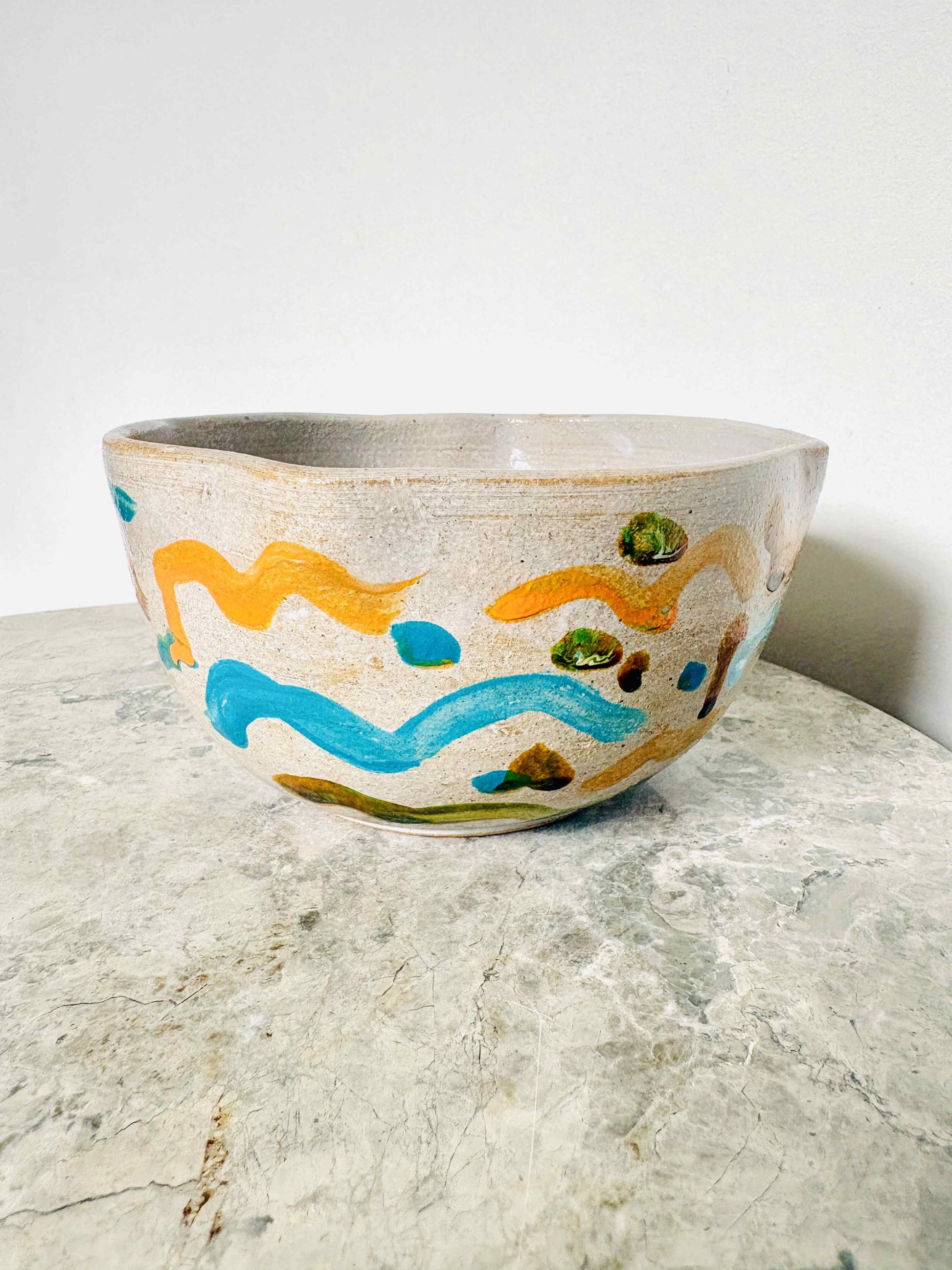- Die Bowl hat einen komplexen Produktionsprozess aus Formen, Glasieren (individuelle Verläufe durch händisches Auftragen) und 3 verschiedenen Brennvorgängen hinter sich (dafür etwa 7 Tage im Ofen verbracht).